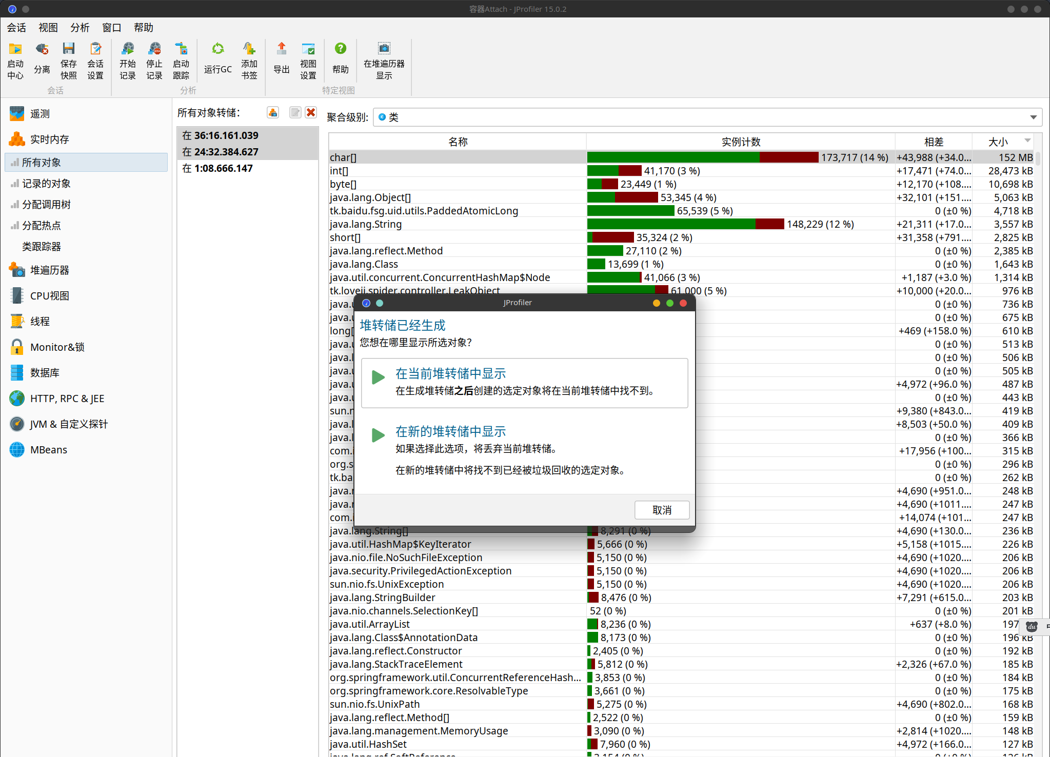 点击所有对象按对象大小排序,聚合级别选择类。 - 右键选择在新的堆转储存展示