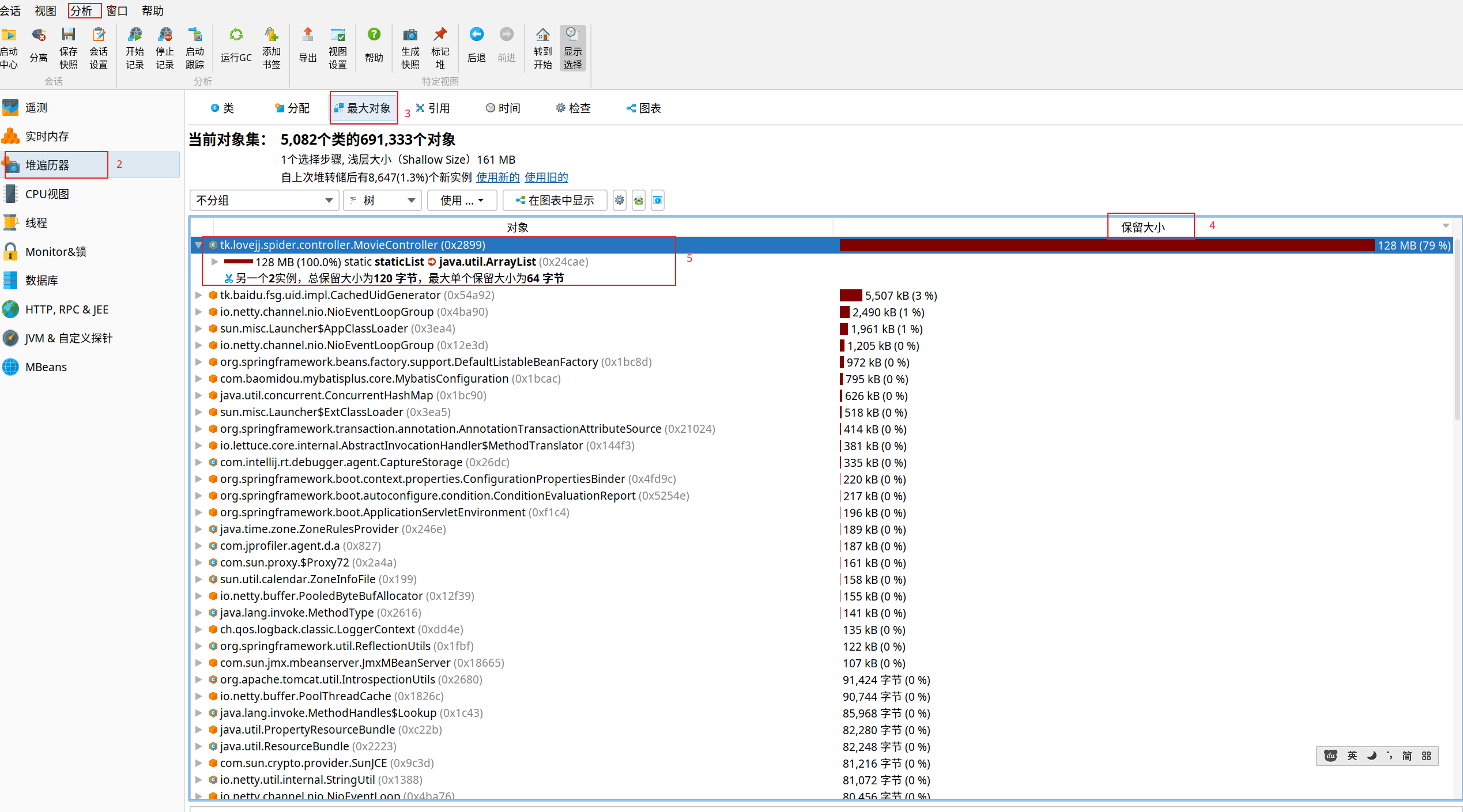 - 点击最大对象-->展开信息-->可以看到movieController的 staticList对象占用了128MB内存找到内存泄露的位置